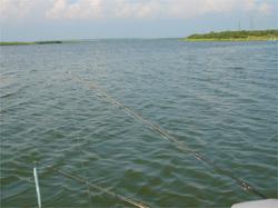 こんな感じの浚渫です。魚探にはあんまり映らないんですが、水面を凝視すると小魚っ気はあるところで、微風の吹き始めなんかのタイミングでポツポツと釣れました。