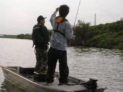 この日は連日の雨により増水はしていないものの普段より流れがキツく、濁りが入っている様子。田中号の30ポンドのフットコンでは釣りにならない為私の船がロープで引っ張りながらの釣りとなった。バッテリーの消費がかなり心配だったがあまり気にせず釣りあがった。とりあえず実績の有るテトラなどを攻めるもバイトが無く何気なく目にとまた上流部のテトラで何とか1本。ルアーはハンダジグ+ジャンボグラブ。