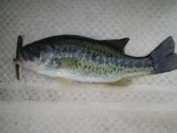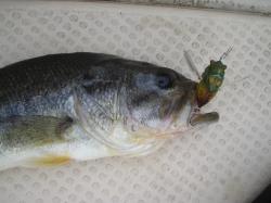 流し始めてから30分、ワームやミノーでシャローを攻めるもノーバイト。そこで、このところ好調と聞いていたシケイダーにチェンジし、セミが落ちてきそうな木の下を狙いキャスト!シェイクをしていると「チュポッ!」という音と共にセミが吸い込まれた・・・・・・しかしすっぽ抜け。何度か同じことを繰り返した後、なんとか乗った!あがってきたのはアフターのガリ痩せバス。長さ的には、この日最長でした。