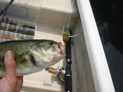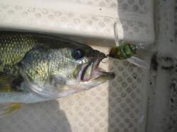 やっぱり出ました。このあたりが一番バイトが多い。一匹釣った後でも、少し時間をおいて入りなおすと、すぐにバイトがあります。バラシも多かったのですが、ここでまた数本のバスをゲット。