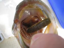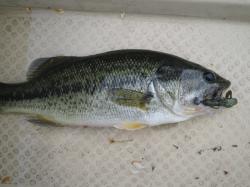 この後、シケイダーに反応が無く、ディープ側にダウンショットを投げるとHIT。25cmほどの子バス君です。腹がパンパンでお尻が真っ赤、これからスポーニングなんだなぁと思いつつリリース。